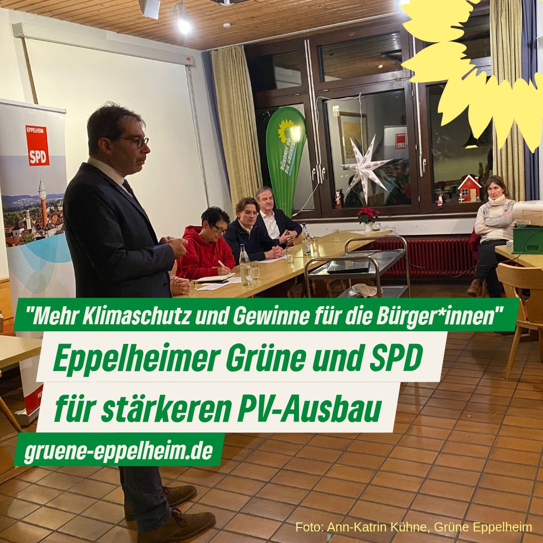 Um dieses gemeinsame politische Ziel zu untermauern und die konkreten Umsetzungen zu diskutieren, luden beide Parteien zur Veranstaltung „Energiewende in Eppelheim – Perspektiven für den PV-Ausbau“ ein, dem viele Bürgerinnen und Bürger folgten.