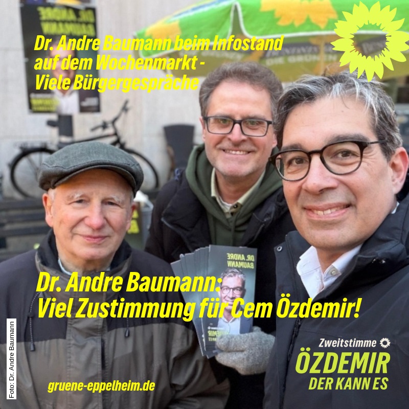 Baumann erlebte beim Infostand am Eppelheimer Markt große Zustimmung für Cem Özdemir und seine Erfahrung: „Gerade jetzt braucht es einen Ministerpräsidenten, der Baden-Württemberg mit klarem Kurs durch die unruhigen Zeiten steuern kann. Die Menschen kennen und vertrauen Cem Özdemir.“