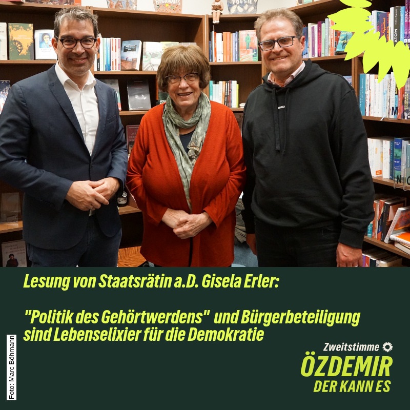 „Positive Bürgerenergie ist ein Überlebenselixier für die parlamentarische Demokratie, gerade in diesen schweren Zeiten. Sie entwickelt konkrete Lösungsvorschläge.“ Dieses und viele weitere Zitate aus ihrem Buch „Demokratie in stürmischen Zeiten. Für eine Politik des Gehörtwerdens“ las Staatsrätin a.D. Gisela Erler im Eppelheimer Buchladen – es war die erste Lesung überhaupt aus dem 2024 erschienenen Werk. „Gisela Erler hat etwas Bleibendes geschaffen und dieses Land verändert“, sagte der Landtagsabgeordnete der Grünen Dr. Andre Baumann, der Erler eingeladen hatte. „Wir können uns Baden-Württemberg gar nicht mehr ohne diese Politik des Gehörtwerdens, ohne eine Beteiligung der Bürgerinnen und Bürger vorstellen.“